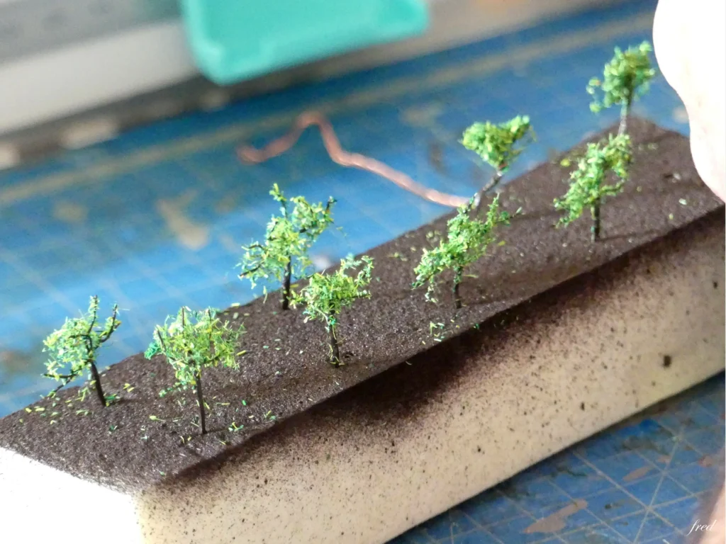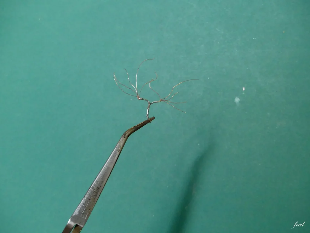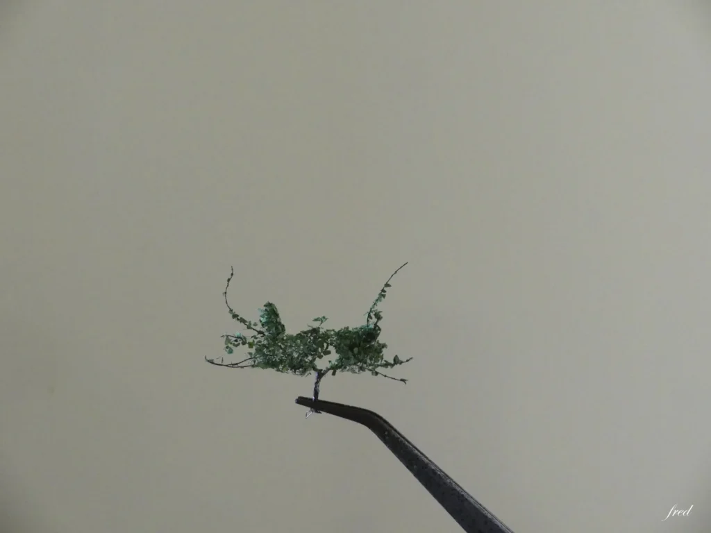La méthode proposée par JClaude a donné satisfaction aux participants, par l’utilisation de fils de cuivre fins, du fer à souder, de la peinture en bombe, de la colle et de feuilles miniatures . Résultat, une vigne miniature est sortie des mains de modélistes ; elle s’implantera sur le nouveau réseau modulaire du club qui évoque le vignoble cognaçais..
