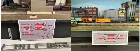 – Pour une approche plus ludique des circulations des panneaux ont été créés et apposés autour du grand réseau. Il permet de connaitre les N° n’aiguilles pour aider les circulations de trains à l’aide de la zapette ROCO ou d’une tablette.